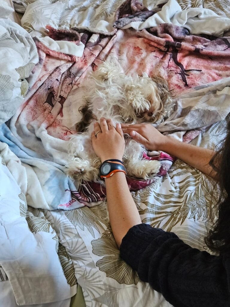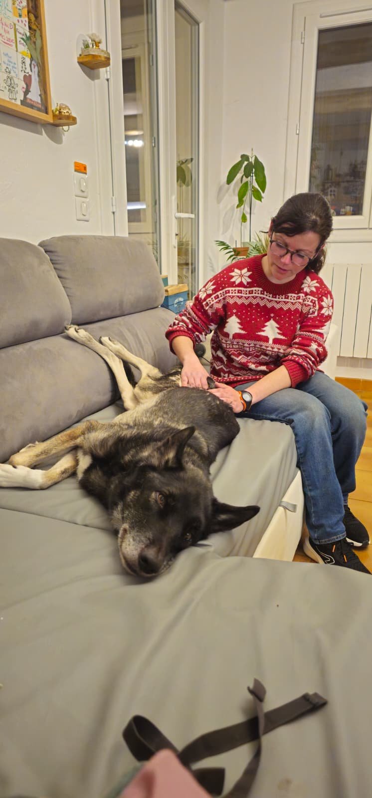 Merci d’avoir accepté Ouate pour vous aider dans la rédaction de votre mémoire en massages canins. Ouate est parfois difficile à aborder car obstinée et joueuse, le défi est relevé. Elle vous a adoptée rapidement. Vos massages lui ont apporté du bien-être, témoin son endormissement lors de la dernière séance.