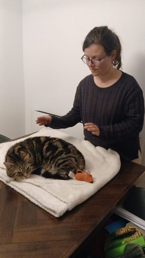 Formée par un maitre Reiki, je suis simplement « canal de l’Energie ». Ici pas de magie, l’animal décide d’où je place mes mains que ça soit au contact ou non de sa peau. Des fois, il faut simplement vivre les choses pour les voir et les croire.